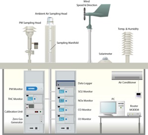 An Air Quality Monitoring Station (AQMS) is a system that measures metrological parameters such as wind speed, wind direction, rainfall, radiation, temperature, barometric pressure and ambient parameters. The AQMS also integrates a series of ambient analyzers to monitor the concentration of air pollutants (such as SO2, NOx, CO, O3, THC, PM, etc.), continuously. HORIBA also provides mobile monitoring stations that can be used to monitor ambient conditions at multiple sites.